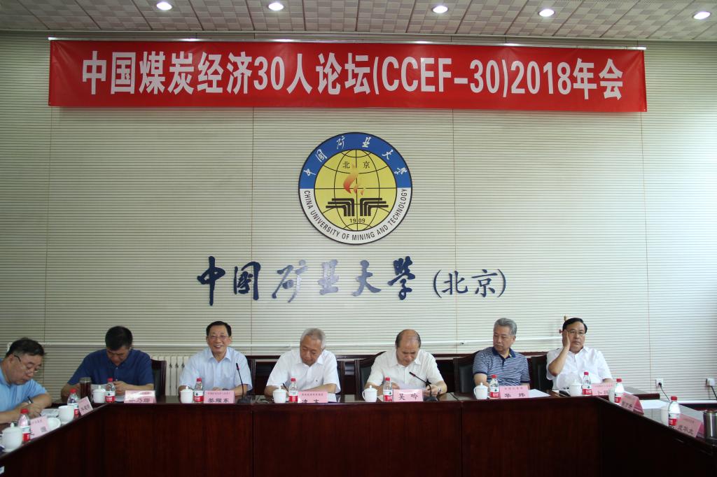 2018年6月30日,中国煤炭经济30人论坛(CCEF-30)成立六周年之际,CCEF-30组委会在中国矿业大学(北京)组织召开了2018年会。会议由北京绿能煤炭经济研究基金会与中国矿业大学(北京)共建的中国煤炭经济研究院承办,国家能源局原副局长、国务院参事室特约研究员、中国能源研究会副理事长、CCEF-30组委会主任吴吟主持。国家能源集团总经理凌文,中国矿业大学(北京)副校长姜耀东,山西煤矿安全监察局党组书记、局长卜昌森,淮南矿业集团原党委书记、董事长王源,兖矿集团战略规划院名誉院长牛克洪,山西省煤炭工业厅原副厅长牛建明,北京绿能煤炭经济研究基金会理事长、陕西煤业化工集团原党委书记、董事长华炜,山东省煤炭工业局党组书记、局长乔乃琛,四川省煤炭产业集团总经理刘万波,同煤集团党委书记、董事长张有喜,山西焦煤集团党委书记、董事长武华太,内蒙古伊泰集团原副总经理翟德元等CCEF-30成员,以及有关方面专家、学者、企业家50余人出席会议;中国煤炭经济研究院在读博士、硕士研究生到会旁听。