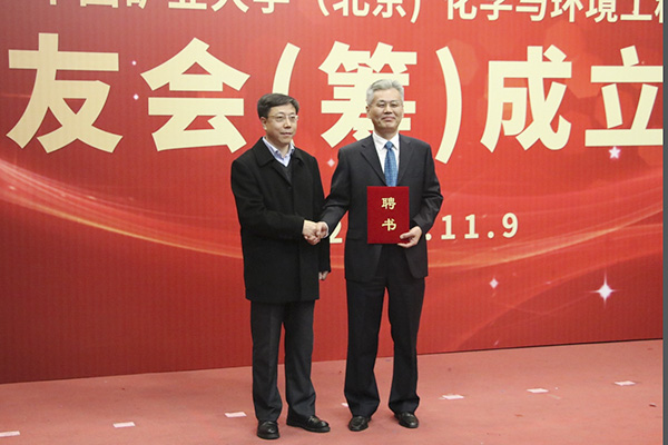 会上,赵峰华为化学与环境工程学院校友会会长朱书全颁发聘书。他对学院校友会(筹)的成立表示热烈祝贺,向支持学校和学院事业发展的校友及社会各界人士表示感谢。他说,学校作为国家煤炭行业的最高学府,始终坚持立德树人根本任务,为实现中华民族伟大复兴的中国梦,贡献了矿大智慧和力量。百年校庆后的十年来,学校办学规模稳步扩大,办学条件不断改善,学科建设成绩显著,高层次人才师资队伍建设不断加强,人才培养质量显著提升,科研水平不断提高。这些成绩的取得是包括化环学院师生和校友在内矿大人共同努力的结果。他指出,学校将以“四个联络”为基础,以“三会”建设为抓手,以“两大目标”为导向积极开展对外联络工作。他还从加强顶层设计、规范校友会运行、为校友提供优质服务和把校友提高到学校人才体系重要组成部分的高度来看待等方面,对化环学院校友会工作提出明确要求。