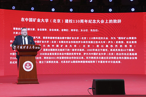 俄罗斯伊尔库茨克国立技术大学、国际矿山测量协会主席阿纳托利·奥霍丁先生代表国外高校致辞。他提出,两校自2011年签署校际合作协议以来,双方教授多次通过互访和联合举办国际会议等形式开展学术交流与合作,建立了深厚的友谊,尤其在矿山勘探和测量领域取得了丰富的学术交流成果。他表示非常高兴能和大家一起见证中国矿大(北京)110周年校庆盛典,并参与“一带一路矿业高校联盟”的成立。希望这是两校合作的新起点,并能推动“一带一路”沿线国家能源高校加强合作,共同承担起清洁能源时代的大学使命。