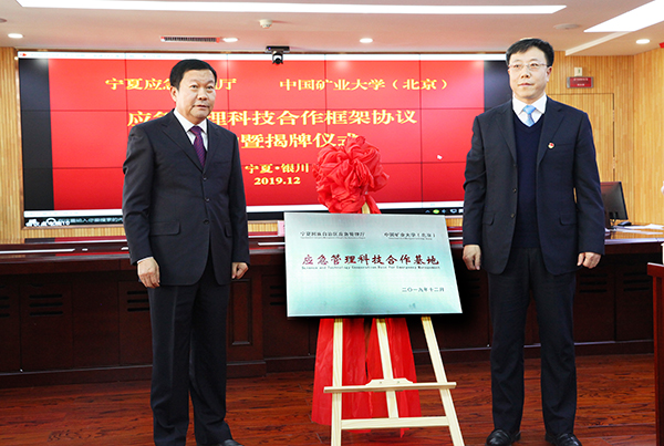 宁夏应急管理厅党组书记、厅长张吉胜与中国矿业大学(北京)副校长赵峰华共同为应急管理科技合作基地揭牌